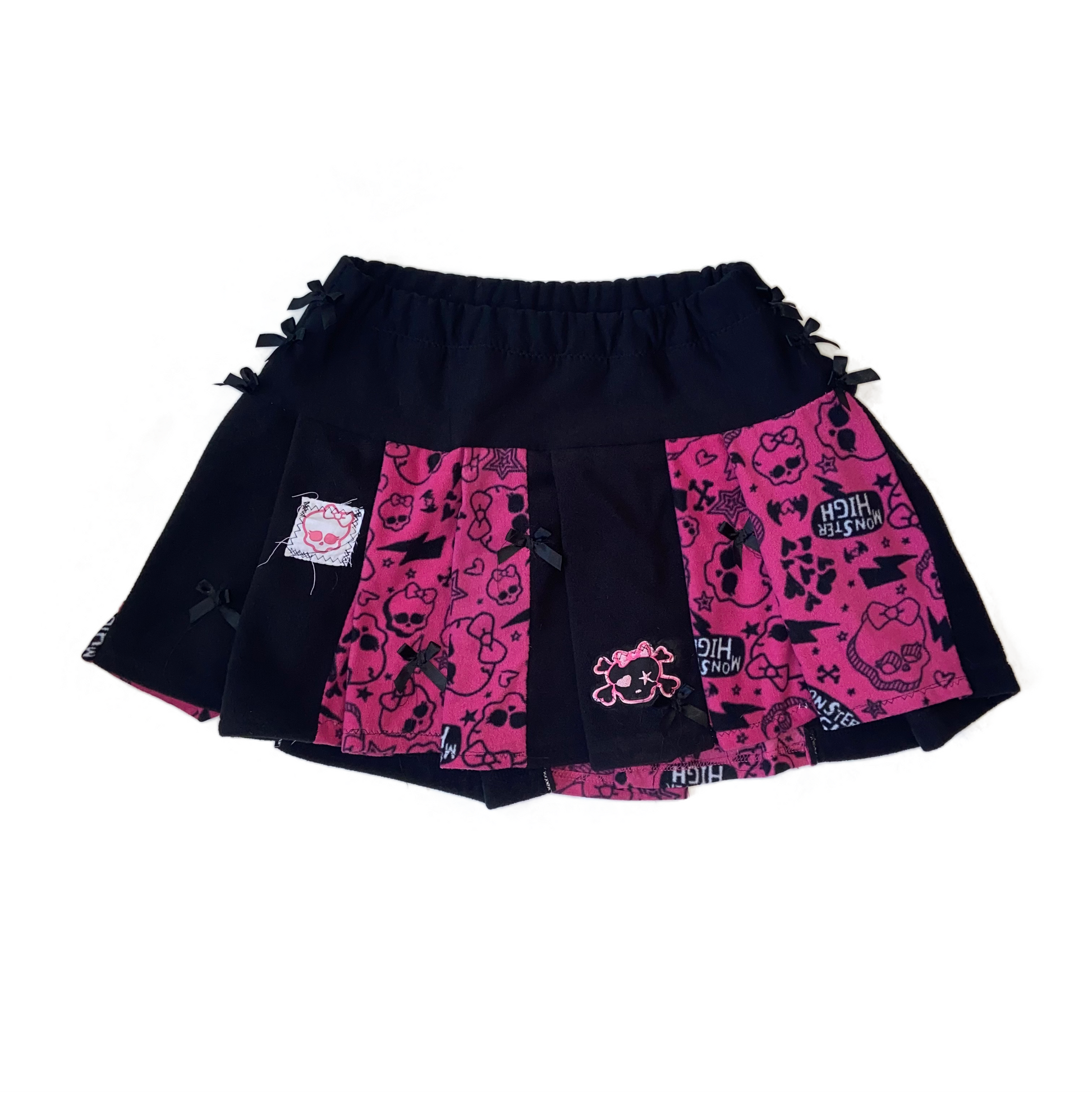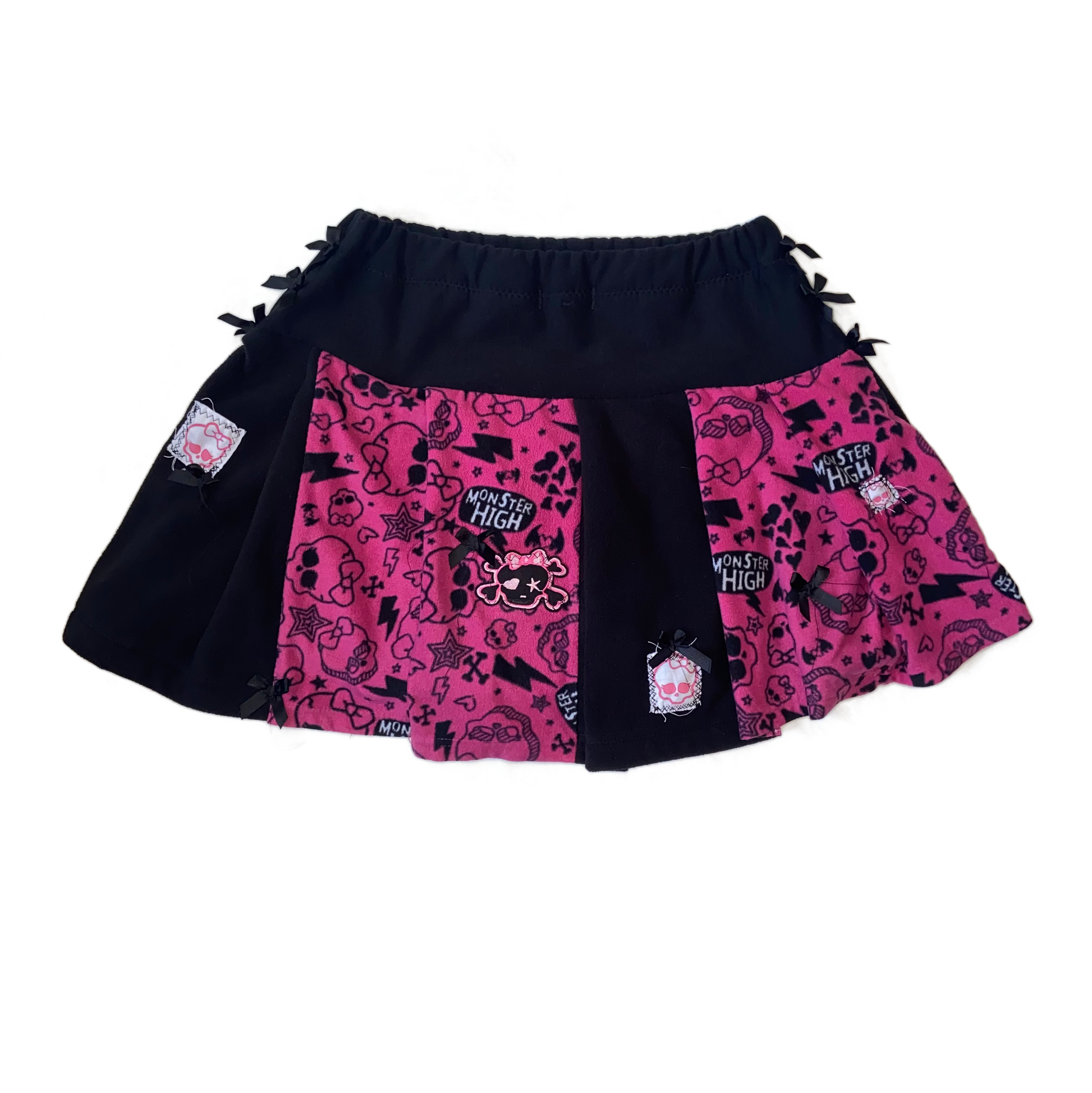 Handmade with ultra-soft plush fabric and featuring a stretchy waistband for maximum comfort, this skirt is a must-have for any Monster High fan. Monster High patches and black bows on both the front and back , freaky chic and fly. <3