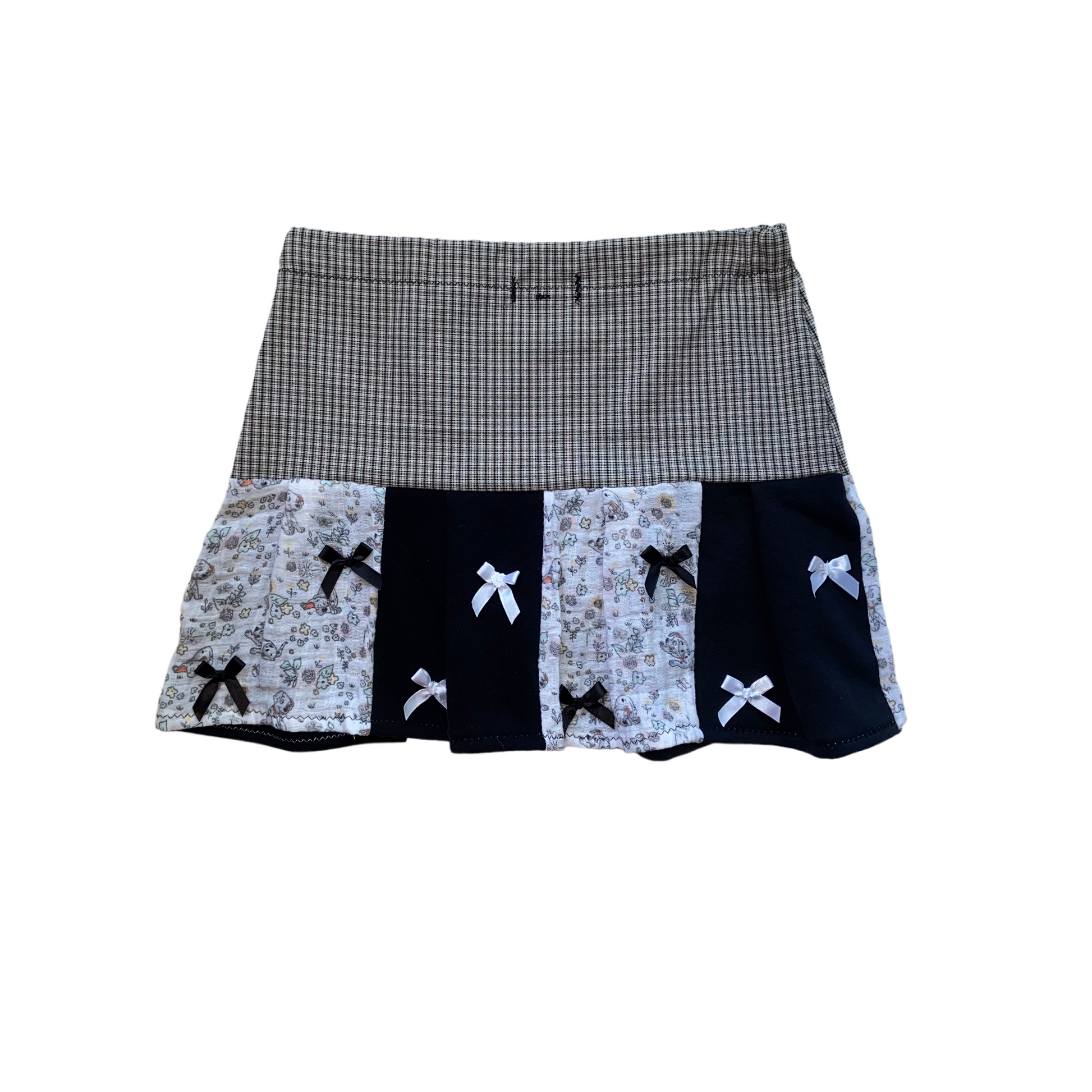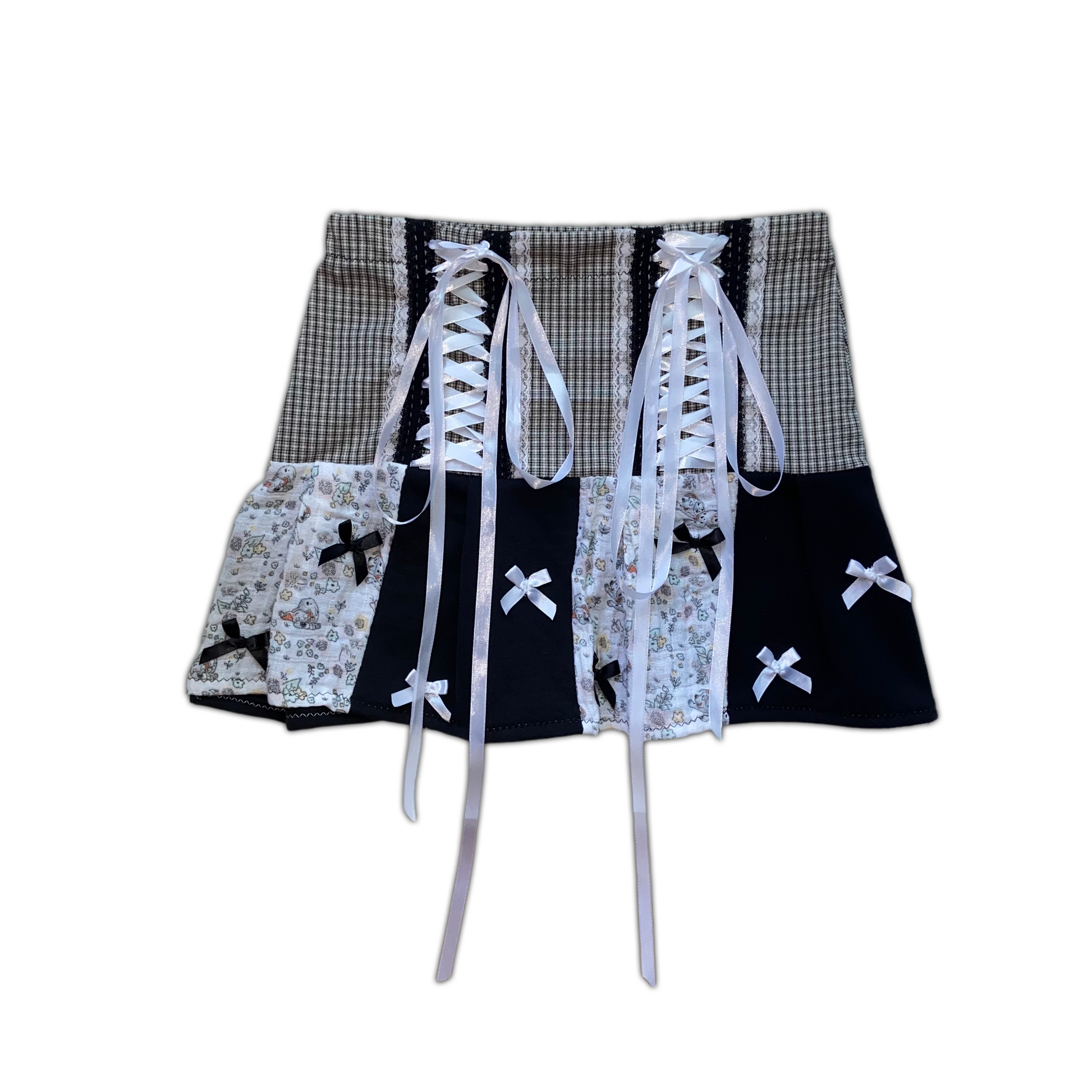live your 101 dalmatians fantasy with this precious one of a kind handmade skirt featuring white lace up corset detailing on the front, a patchwork design and bows all over <33