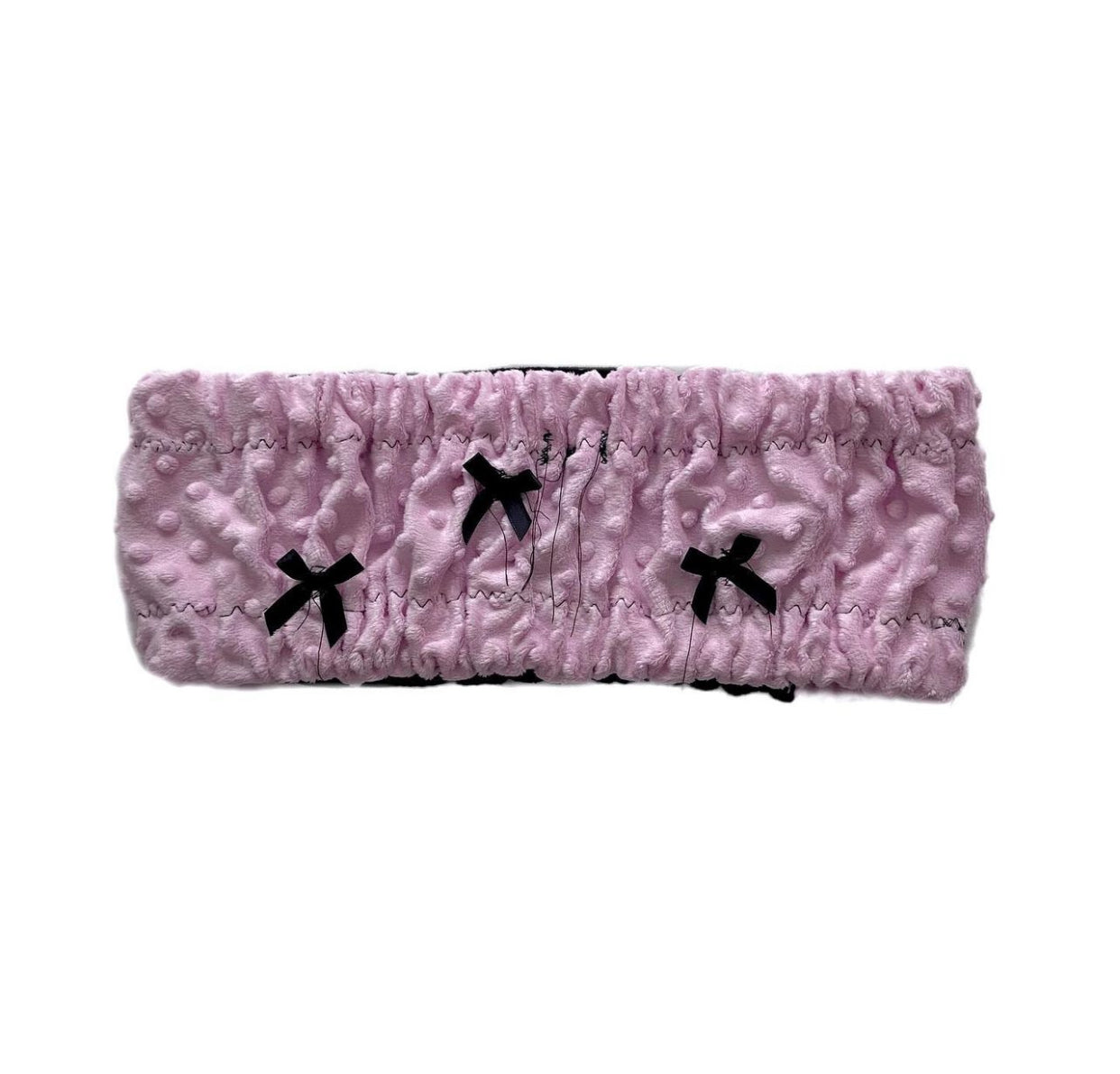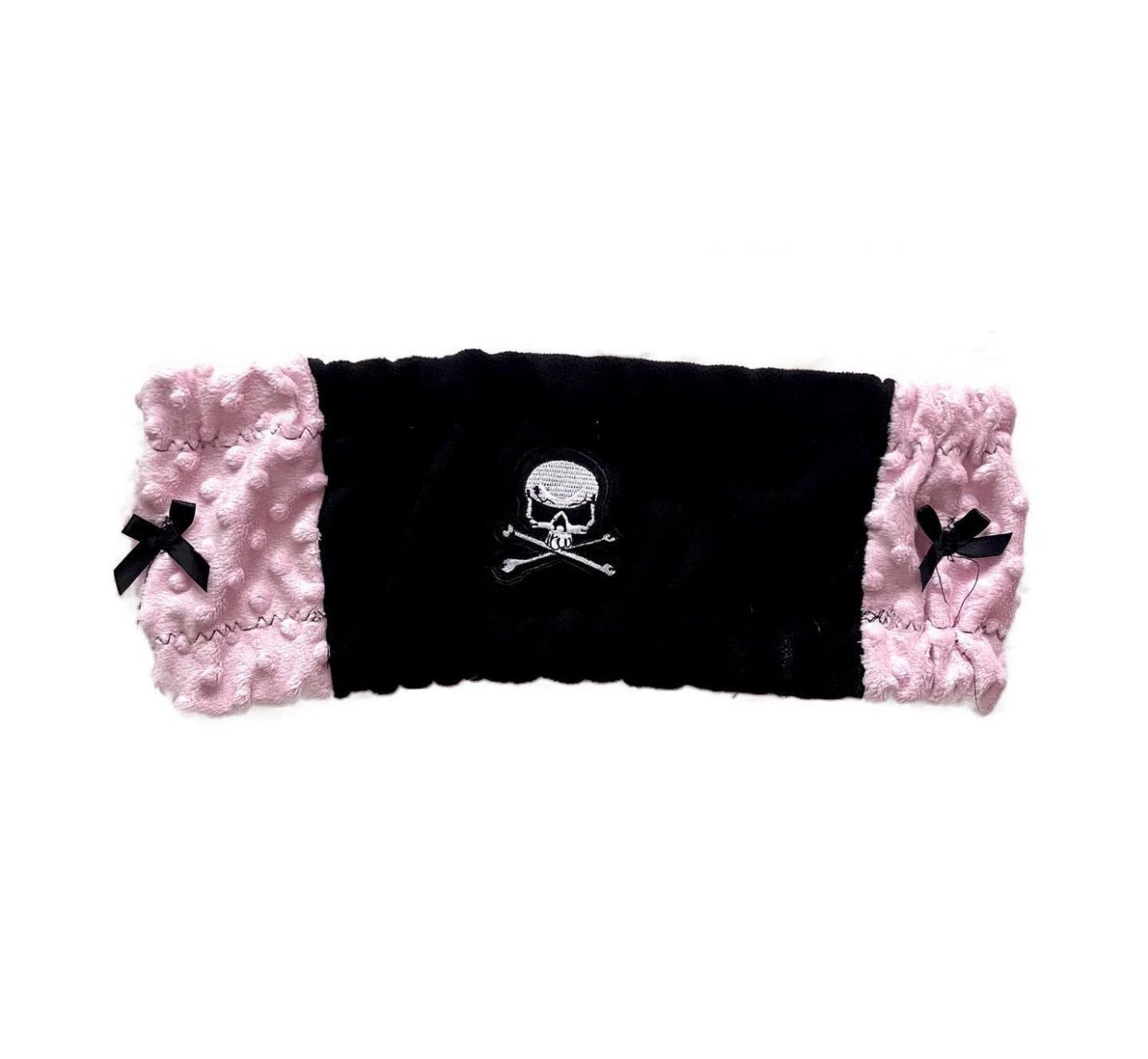 this handmade bandeau top features a plush soft pink and black fabric with a skull patch on the front <3 she also features an elastic band for comfort and stability