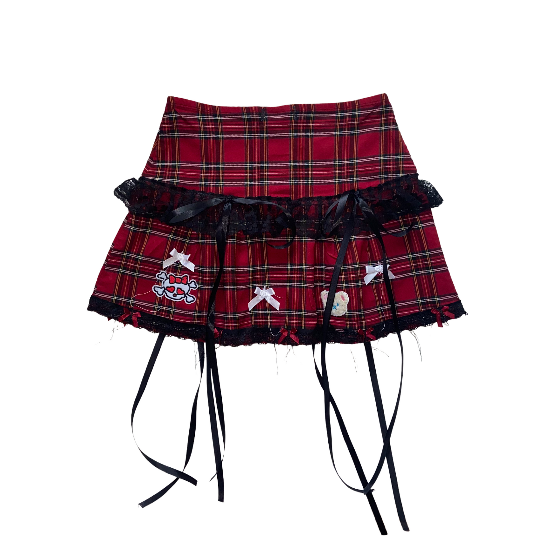 </3 Crafted with red tartan, tiered lace design and detailed patches with bows for a unique look . feel like a punk princess in this unique handmade skirt and get ready to grab attention bb xxx