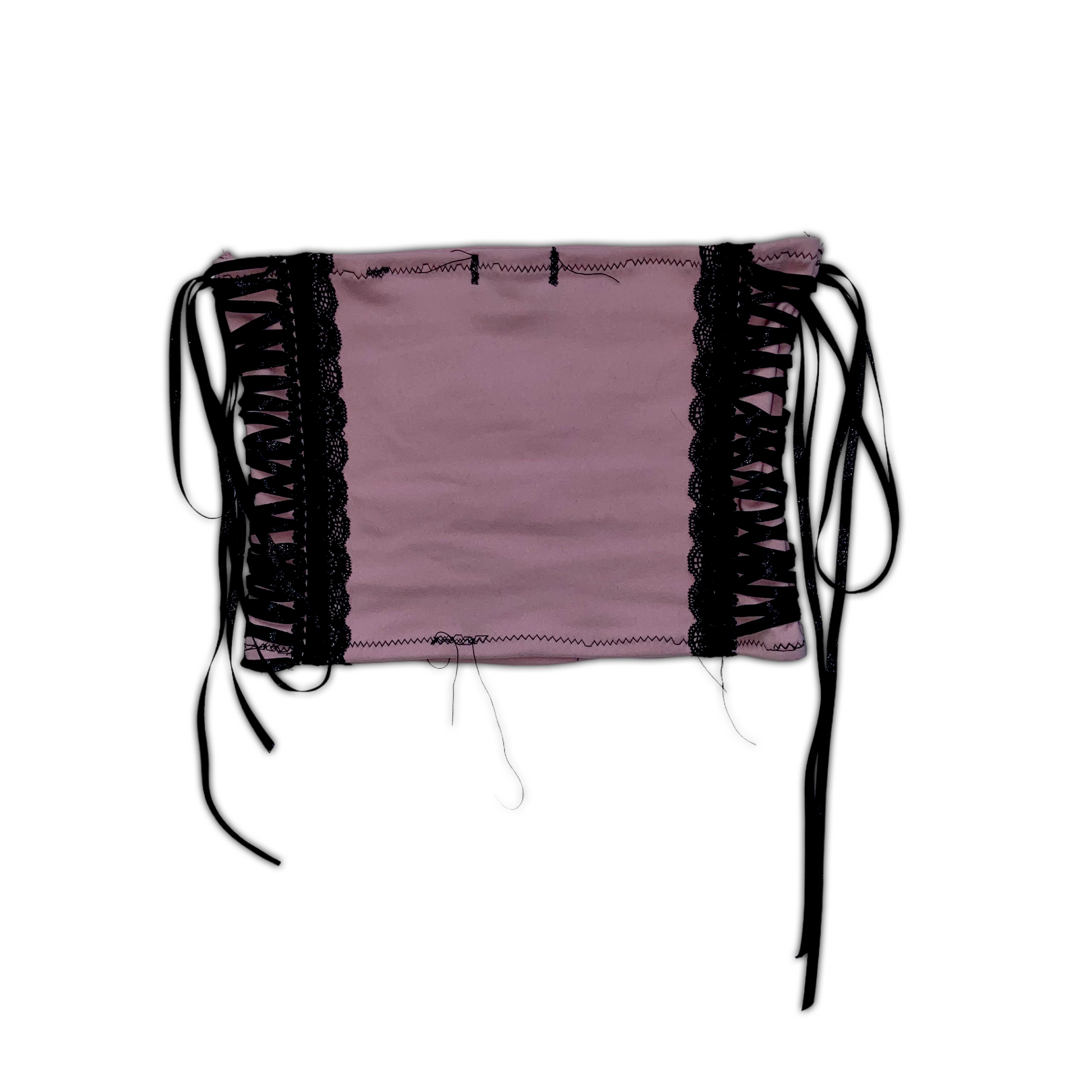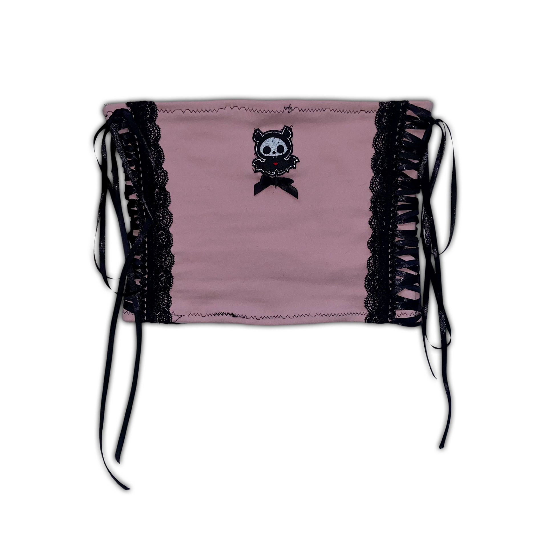 pink strapless crop top with skelanimals patch and bow on the front, lace up black corset detailing on the sides